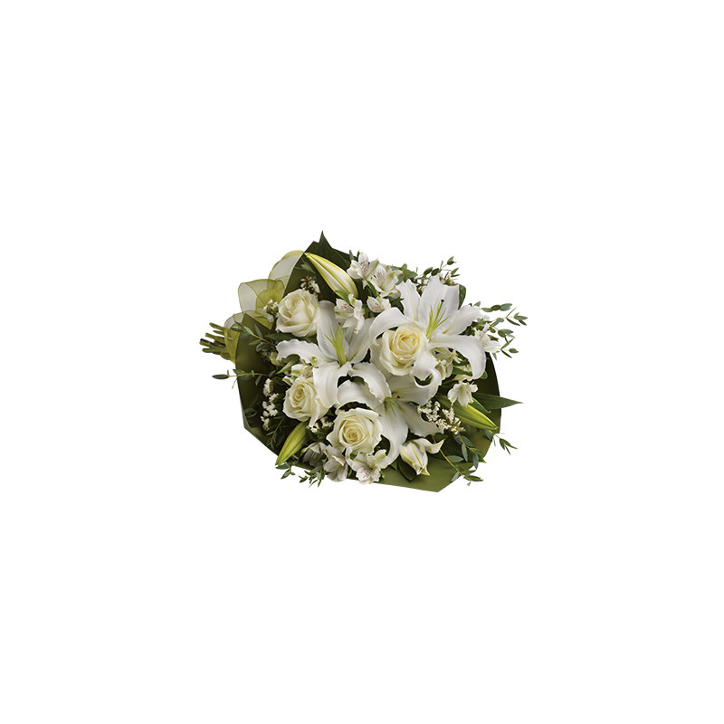 molto elegante questo mazzo di fiori bianchi composto di rose bianche, lilium bianchi, alstroemeria bianchi