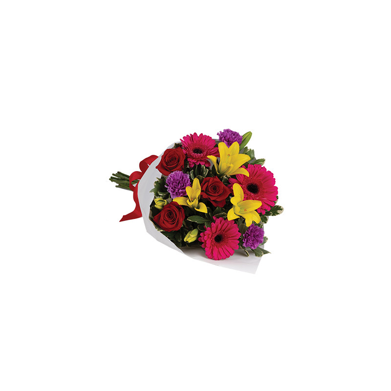 rose rosse, gerbere rosse, lilium gialli, garofani violetti.