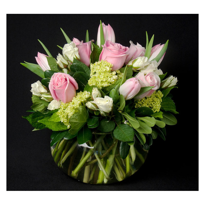 boule di vetro con rose bianche, rose rosa, tulipani rosa, viburno