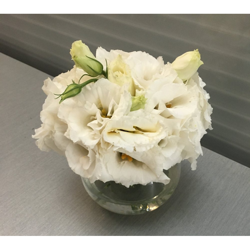 BOUQUET ROTONDO DI FIORI BIANCHI, GERBERE, GAROFANI, E ROSE ROSA.