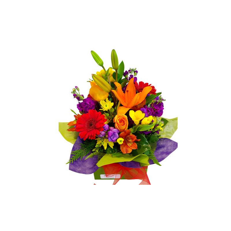 Bouquet rotondo con gambo allungato di zantedeschia arancio e aspidistre rivoltate