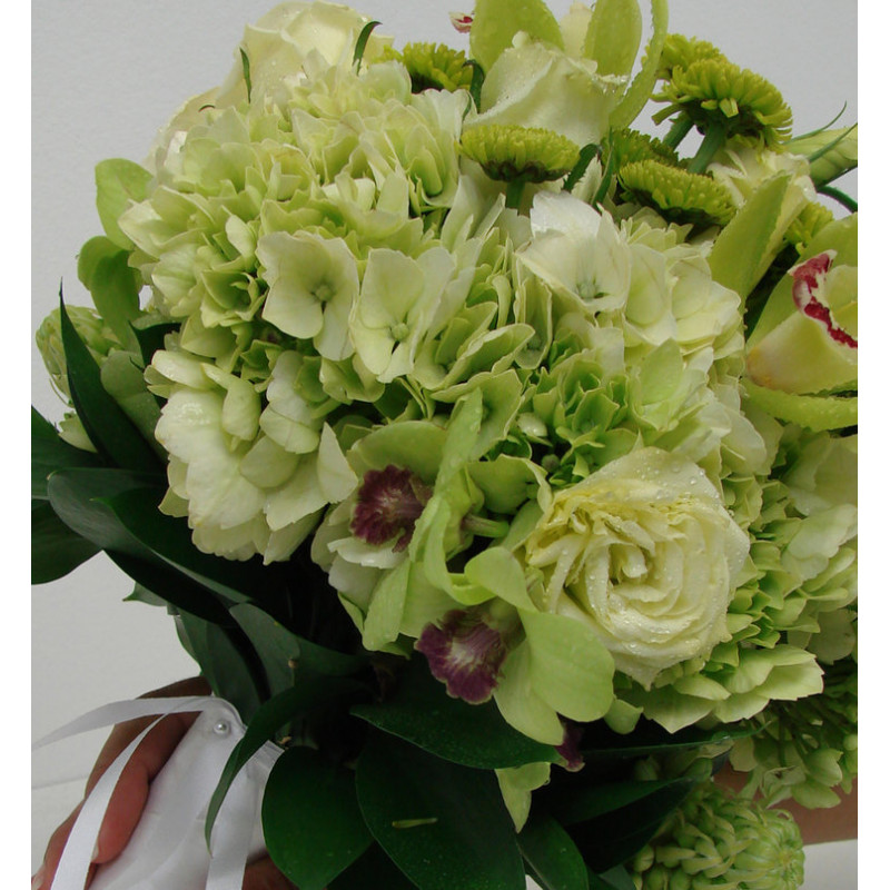 Bouquet da sposa rotondo colore bianco/verde con ortensie, rose, orchidee, e altri fiori accessori