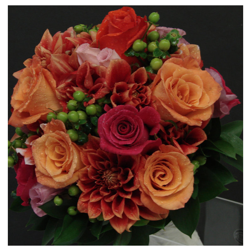 Bouquet rotondo compatto con dalie, rose, iperico verde, nei toni caldi del rosso/arancio