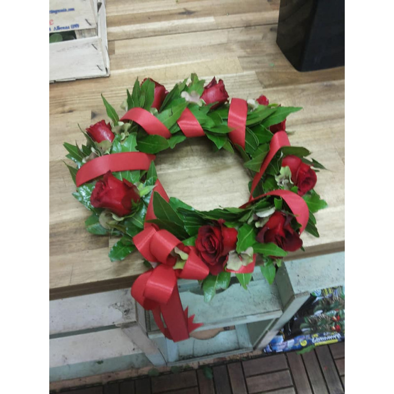 Coroncina per laurea realizzata con alloro, rose rosse, nastro rosso in raso, avvitato