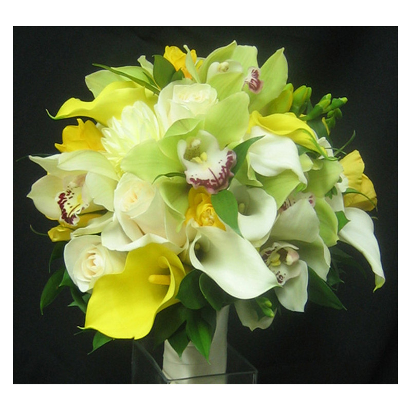 Calle bianche, calle gialle, rose bianche, orchidee verdi, compongono questo bouquet da sposa luminoso