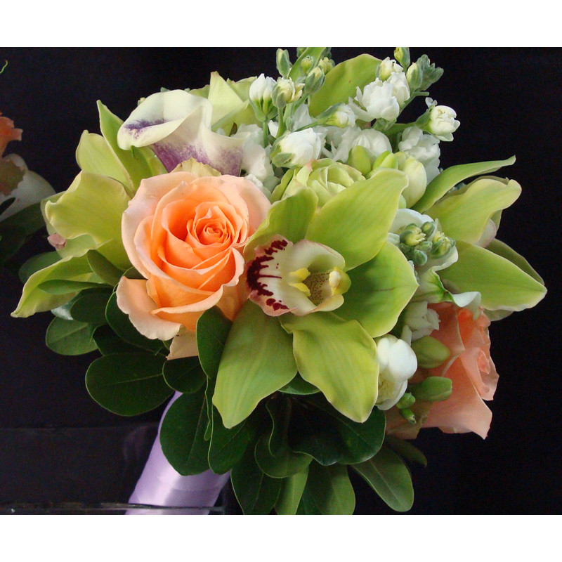 garofanini bianchi, calle bianche sfumate di lilla, orchidee verdi, e rose salmone per questo bouquet da sposa esilarante