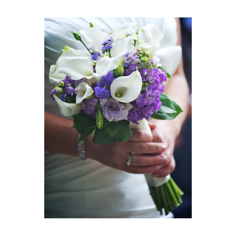 Calle bianche, lisiantus lilla, violaciocca violetta, statice violetto, compongono un bouquet sobrio