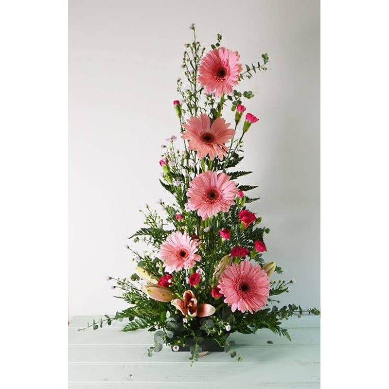 COMPOSIZIONE IN CIOTOLA FIORI RECISI CON GERBERE, LILIUM, E GAROFANINI , TUTTI DI COLORE ROSA