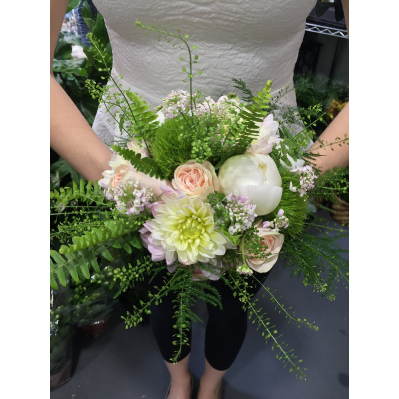 Peonia bianca, dalia rosa sfumata, phlox rosa ed elementi vegetali che richiamano all'effetto bosco
