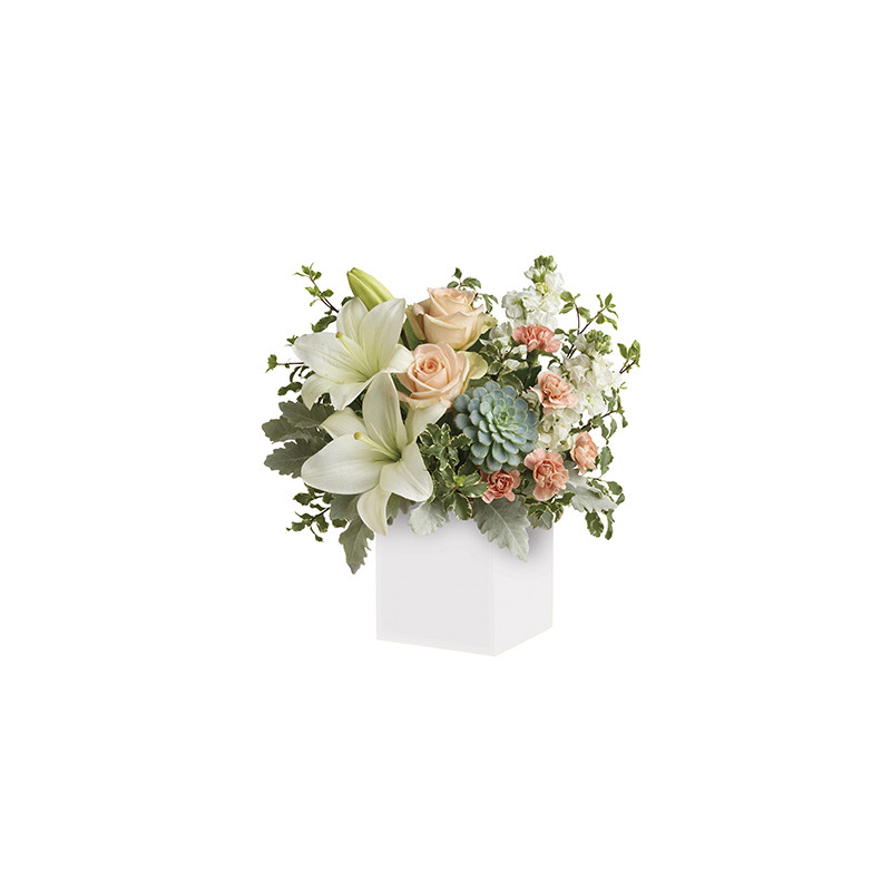 composizione bianco/rosata con lilium bianchi, rose rosa, garofani rosa, violaciocca bianca, pianta di echeveria