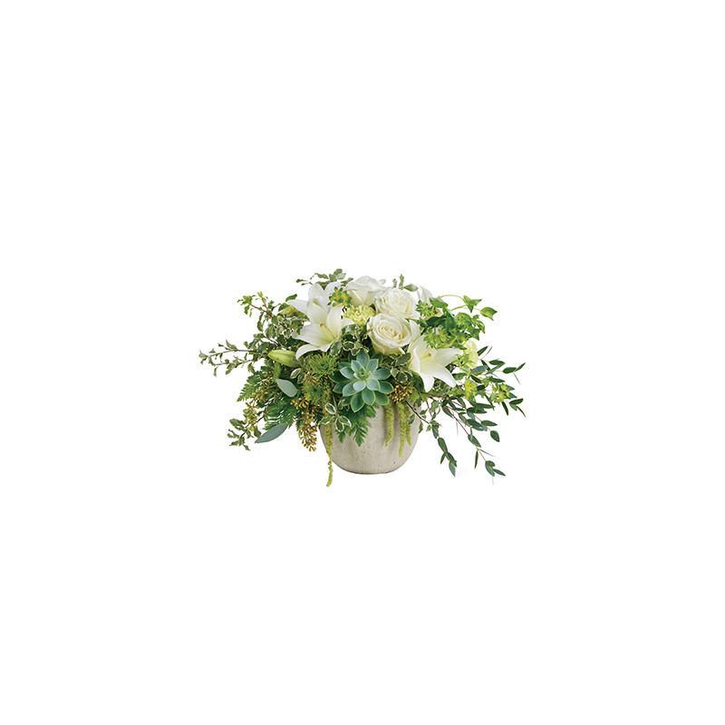 centrotavola con fiori bianchi come lilium, piante di echeverie, ecc