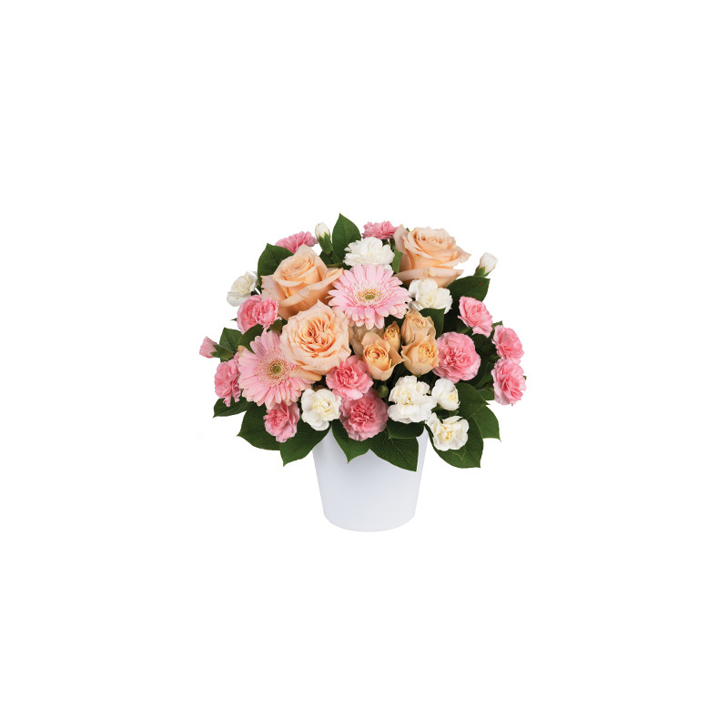 tutte tinte pastello per questa composizione di rose, gerbere, garofani